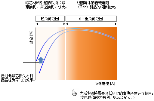 功率电感器的损耗会因负荷大小而发生变化。中~重负荷时流过电感器的电流中直流偏置电流较大,因此主要为绕组的直流电阻(Rdc)引起的铜损。而在轻负荷时,由于几乎不会流过直流偏置电流,因此铜损会下降,但在待机状态下也会有一定频率的开关工作,因此主要为磁芯材料的铁损,从而效率会大幅下降(图3)。