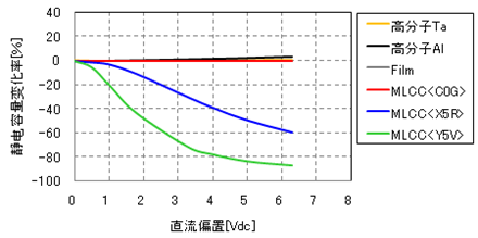 直流偏置特性是指,对电容器施加直流电压时实际静电容量发生变化(减少)的现象。这种现象是使用了钛酸钡系铁电体的高介电常数类片状多层陶瓷电容器特有的现象,导电性高分子的铝电解电容器(高分子AI)和导电性高分子钽电解电容器(高分子Ta)、薄膜电容器(Film)、氧化钛和使用了锆酸钙系顺电体的温度补偿用片状多层陶瓷电容器(MLCC
