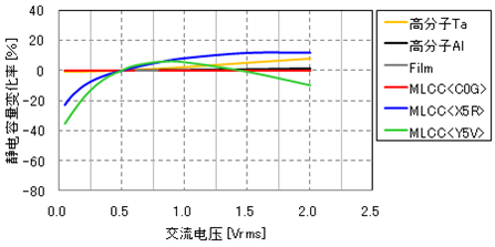 交流电压特性是指,对电容器施加交流电压时实际静电容量发生变化(增减)的现象。这一现象与直流偏置现象相同,是使用钛酸钡系铁电体的高介电常数类片状多层陶瓷电容器特有的现象,导电性高分子的铝电解电容器(高分子AI)和导电性高分子钽电解电容器(高分子Ta)、薄膜电容器(Film)、氧化钛和使用锆酸钙系的顺电体的温度补偿用片状多层陶瓷电容器(MLCC