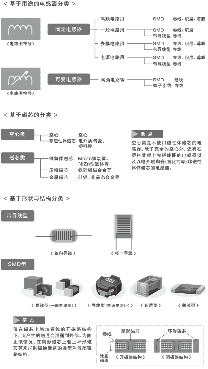 电感器根据高频电路用、一般电路用、去耦电路用、电源电路用等用途,推出了各类产品。还有能够改变电感的可变电感器,但基本上都为固定电感器。从形状上看大致分为带导线型(轴向导线、径向导线)与SMD(表面贴装元件)型,从结构上分为卷线型、积层型、薄膜型。