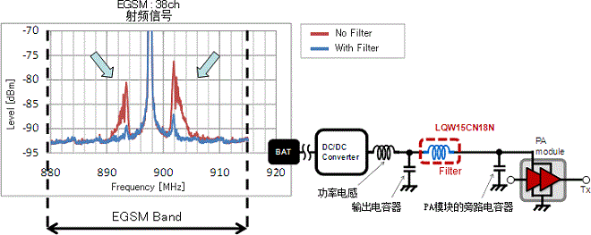 经确认,紧接着DC-DC转换器的输出LC (功率电感与输出电容器) 之后插入LQW15CN18N,使智能手机的射频信号附近频带的杂散发射得到了改善。