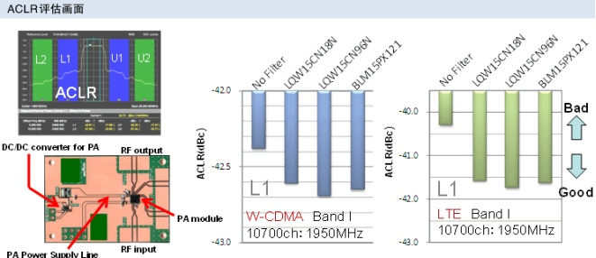 经确认,紧接着DC-DC转换器的输出LC (功率电感与输出电容器) 之后插入LQW15CN系列或BLM15PX121SN1,使W-CDMA和LTE的ACLR得到了改善。