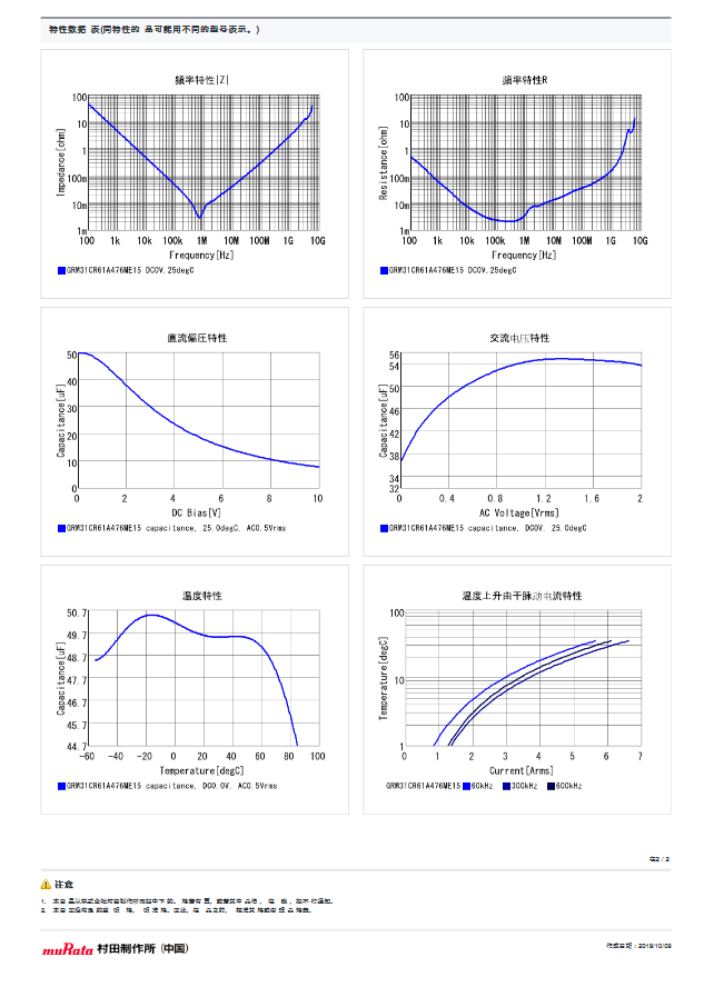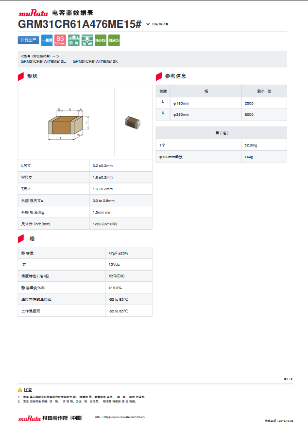 下面如题的为 1206 47UF 10V GRM31CR61A476ME15L 村田贴片电容规格书