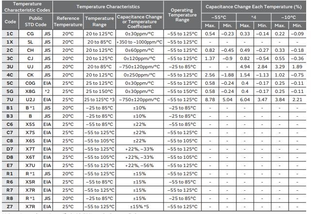 村田贴片电容的温度特性有两种:JIS与EIA,具体参数如下表表示