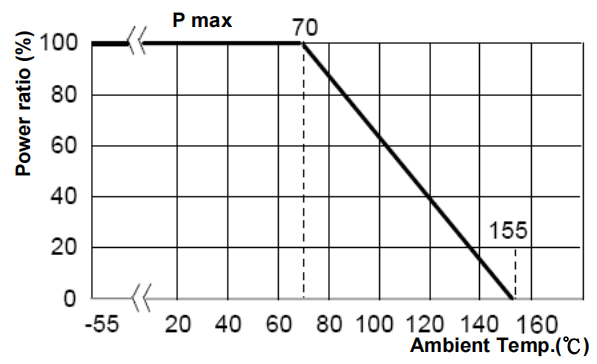 电阻的额定功率与环境温度的关系,当环境温度70℃≤ ℃≤155℃时,100%≥Pe≥0%。关系图如下: